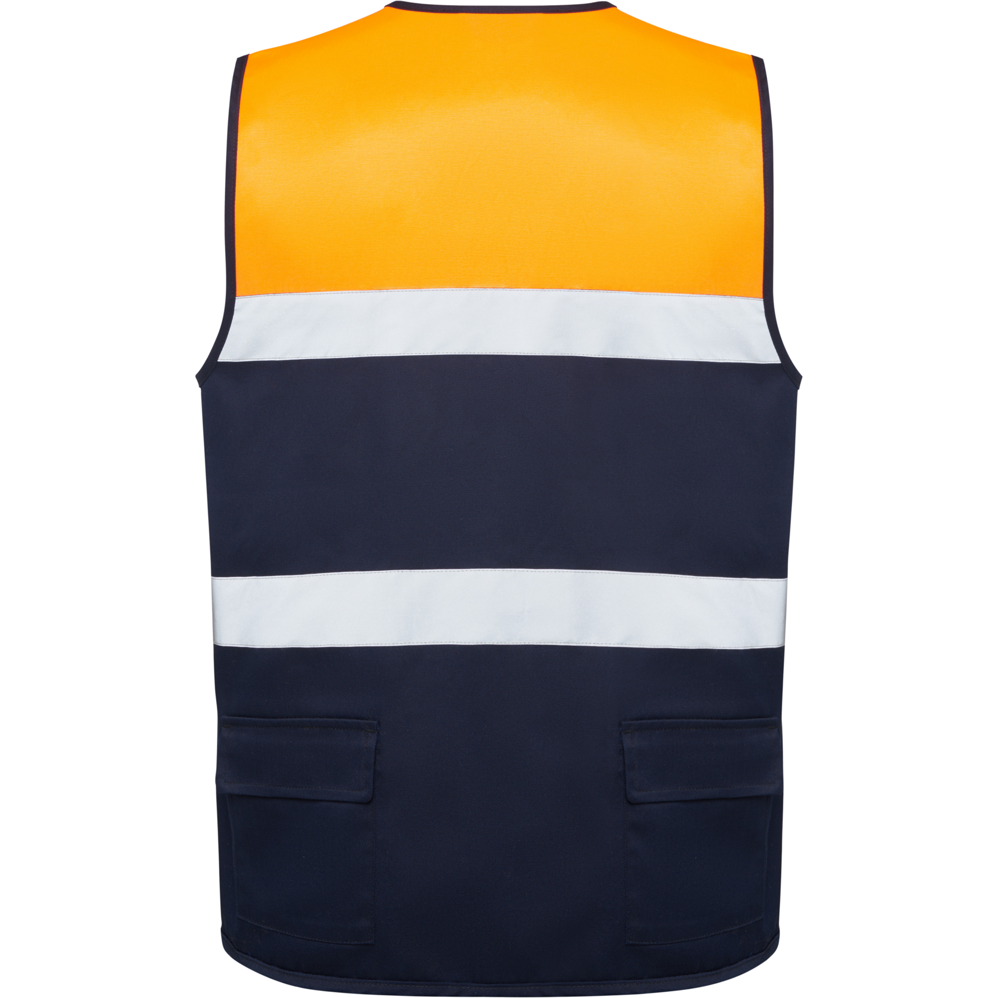 Chaleco multibolsillos de alta visibisidad. · Dos cintas reflectantes en pecho. · Escote en forma de pico y cremallera de Nylon. · Bolsillo superior en pecho derecho, con argolla metálica. · Dos bolsillos en pecho con fuelle, tapeta y cierre de velcro. · Dos bolsillos laterales con fuelle y cierre de cremallera con dos bolsillos superpuestos con tapeta y cierre de velcro. · Dos cintas reflectantes traseras en cintura y espalda. · Dos bolsillos en la parte trasera con tapeta y velcro. · Modelo Ribeteado con bies.