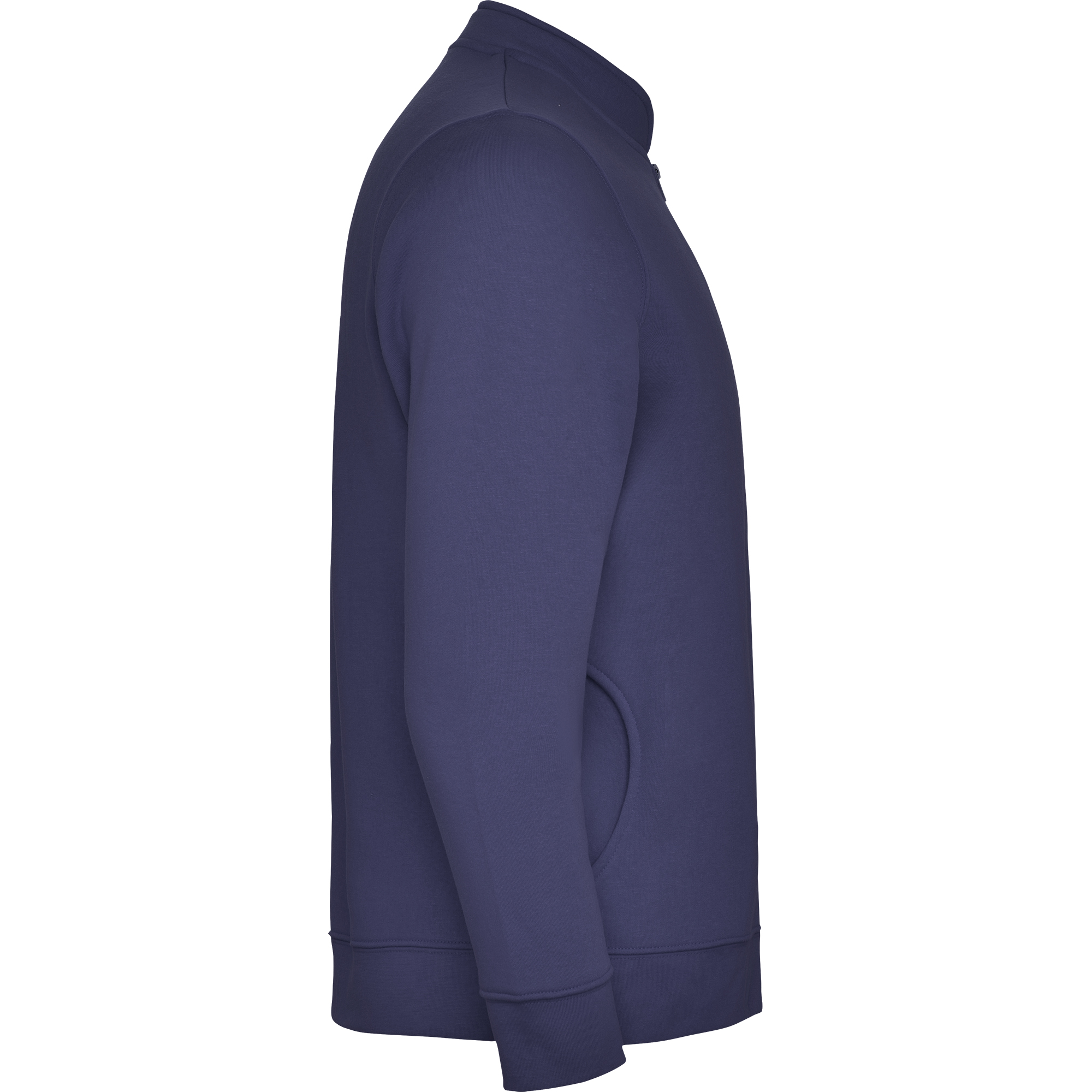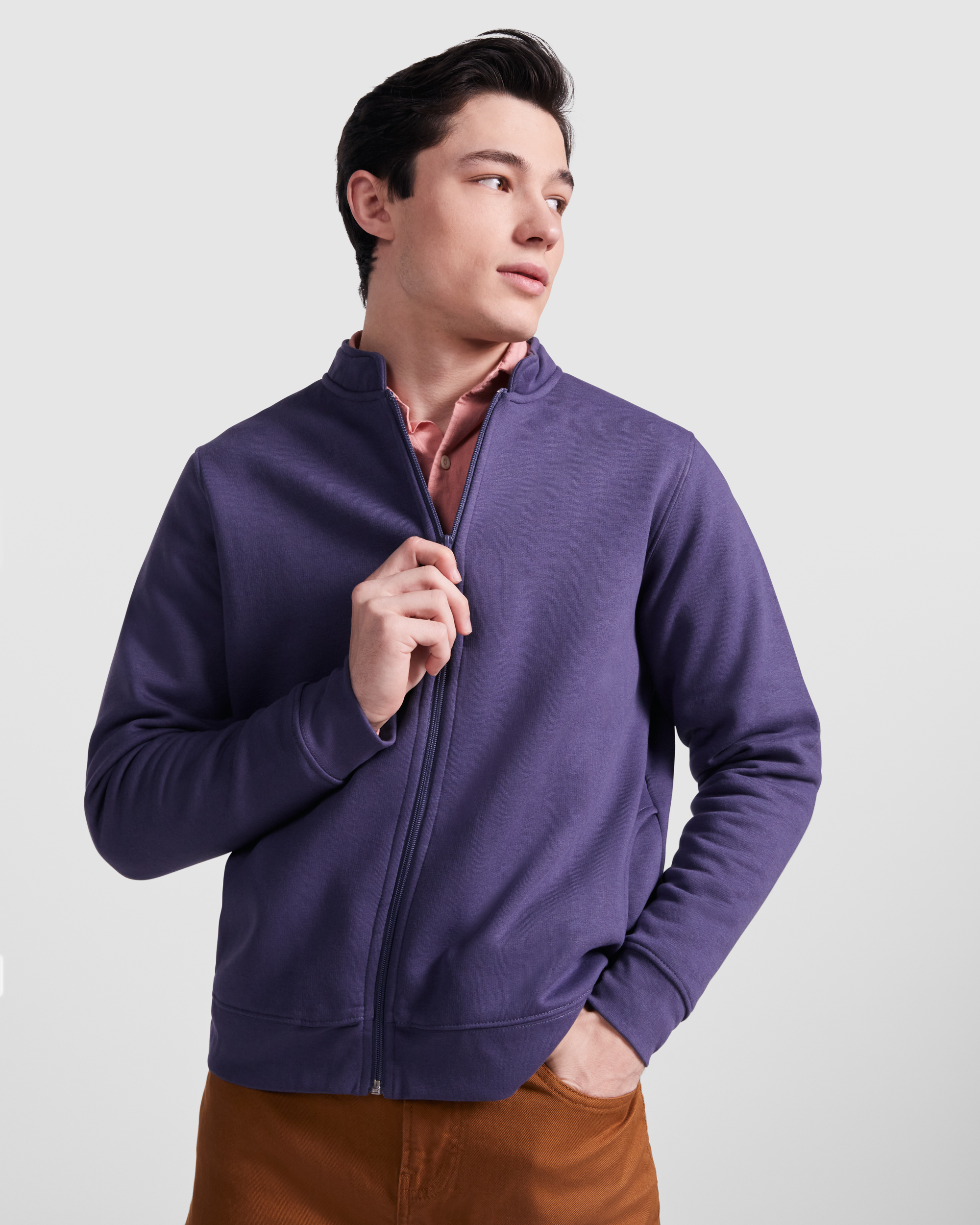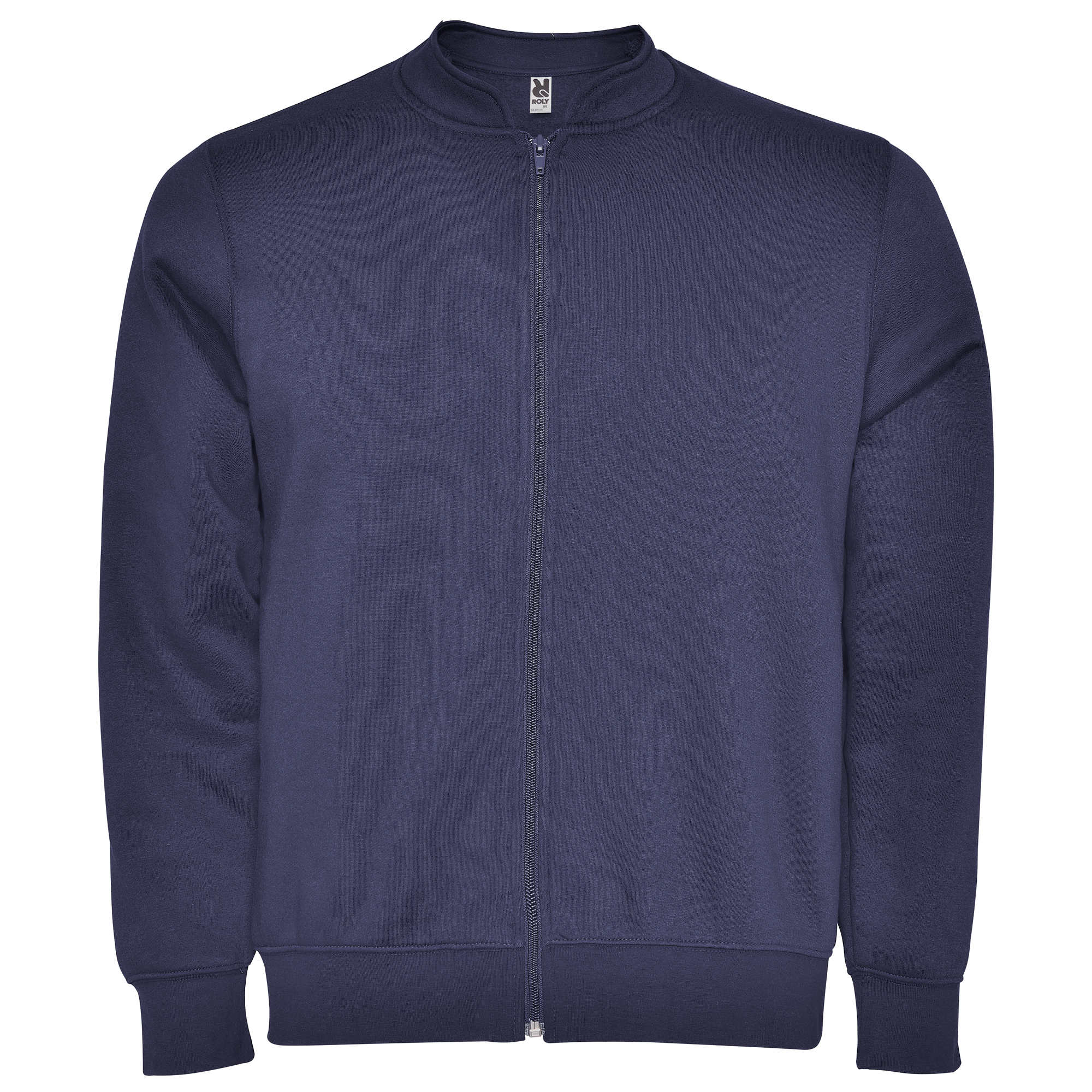 Sudadera de felpa perchada de manga larga con cuello Mao. Cubrecosturas reforzado en el interior del cuello. Cremallera central con tirador al tono. Bolsillos laterales. Punto canalé 1×1 en puños y cintura.