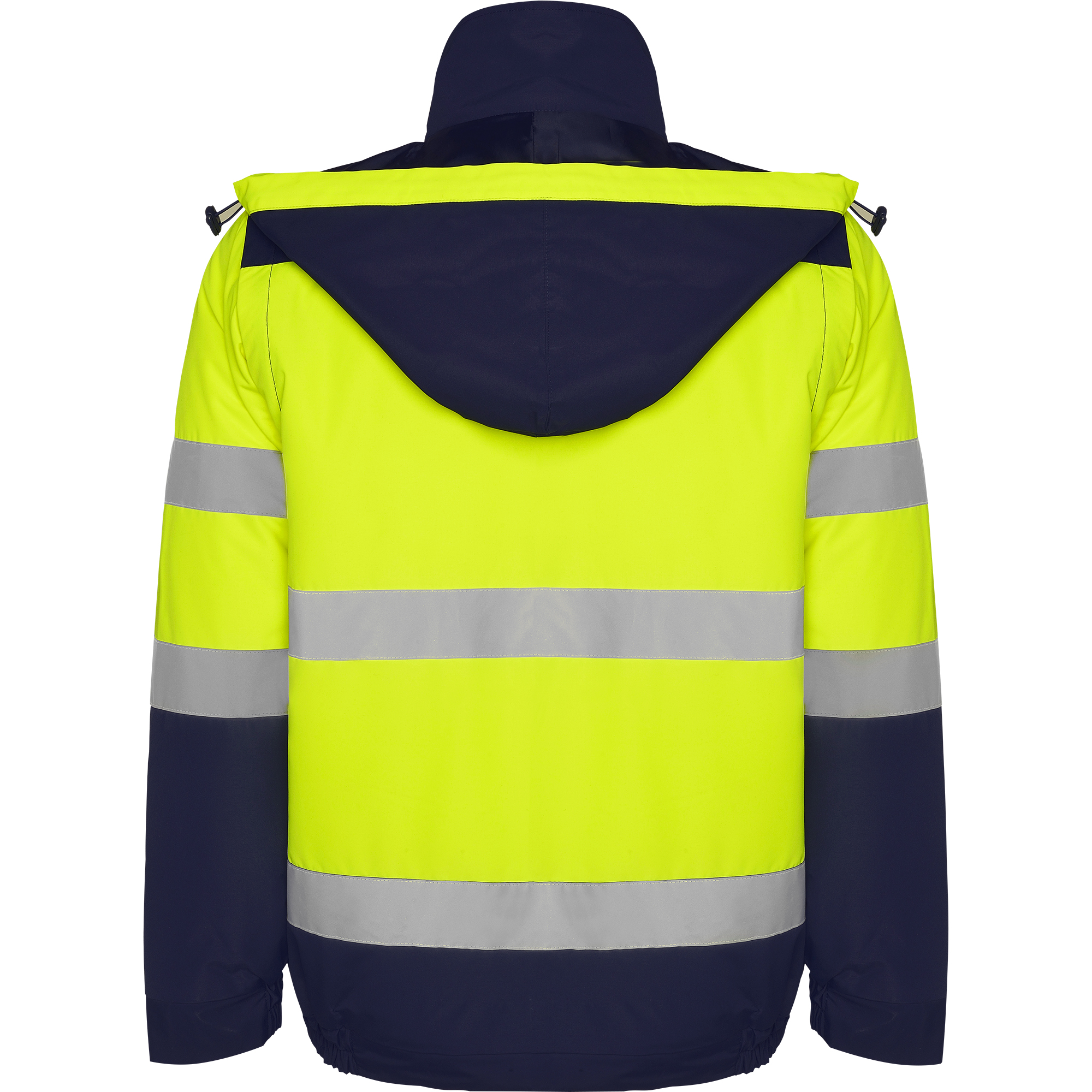 Parka acolchada de alta visibilidad combinada en dos colores. · Capucha enrollable con cordón ajustable y ribete flúor. · Bolsillo en la zona del pecho con cremallera. · Dos cintas reflectantes en el cuerpo y las mangas. · Mangas desmontables. · Dos bolsillos frontales ligeramente inclinados de fácil acceso. · Puños ajustables por zona elástica y por cierres en velcro. · Tapeta central con cierre de velcro y cremallera central flúor con tirador. · Acceso interior para serigrafía. · Bajo con zona elástica.