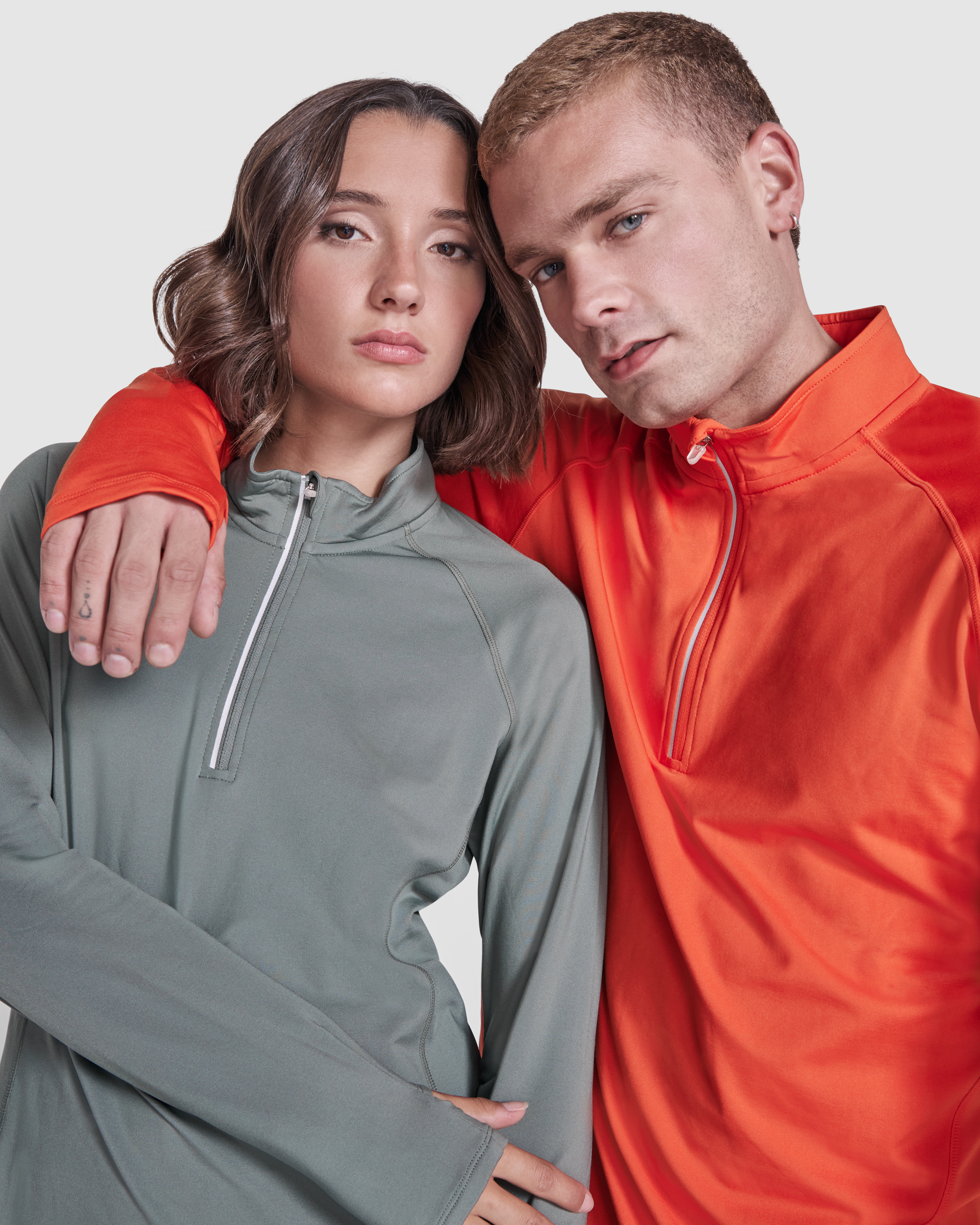 Sudadera técnica entallada de manga larga ranglán para mujer. Cuello con media cremallera invertida y banda reflectante. Cubrecosturas de refuerzo. Puños con apertura para el pulgar. Detalles reflectante en espalda. Bajo espalda ligeramente mas largo que el delantero. Tejido interior cálido perchado.