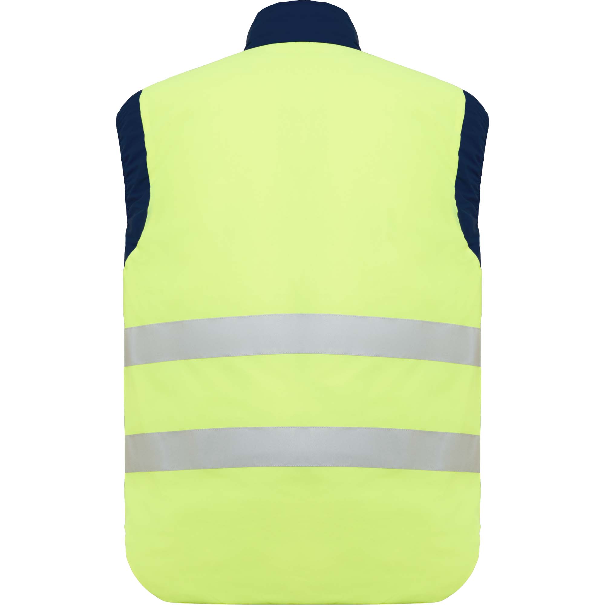 Chaleco reversible multibolsillos y alta visibilidad, con cuello alto. Chaleco multibolsillos. · Cremallera central con tirador reversible. · Un bolsillo exterior para móvil en lado derecho. · Dos bolsillos frontales con fuelle y aberturas laterales. · Dos depósitos para bolígrafos. · Bolsillo cremallera. · Cortavientos en bocamangas. · Bajo posterior con faldón. · Ajustador elástico. Chaleco alta visibilidad · Color fluorescente. · Dos bandas reflectantes horizontales.