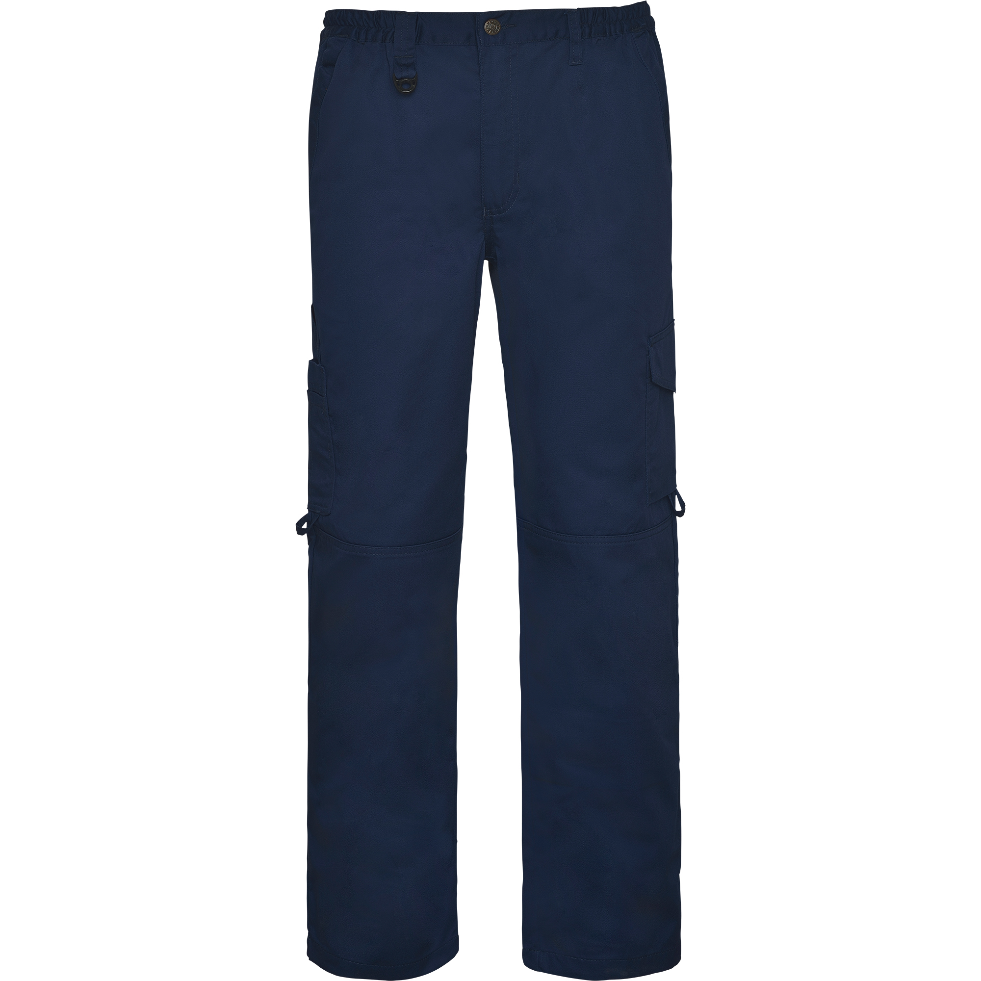 Pantalón largo laboral corte recto sin pinzas. · Cinturilla elástica para mayor adaptación. · Cintura con colgador para llaves. · Dos bolsillos traseros y un bolsillo lateral con cierre de cremallera en el lado derecho. · Dos bolsillos laterales, izquierdo con tapeta y fuelle más un bolsillo interior y derecho con varios compartimentos. · Bolsillos interiores para protección de las rodillas. · Trabillas en bolsillos traseros y laterales.