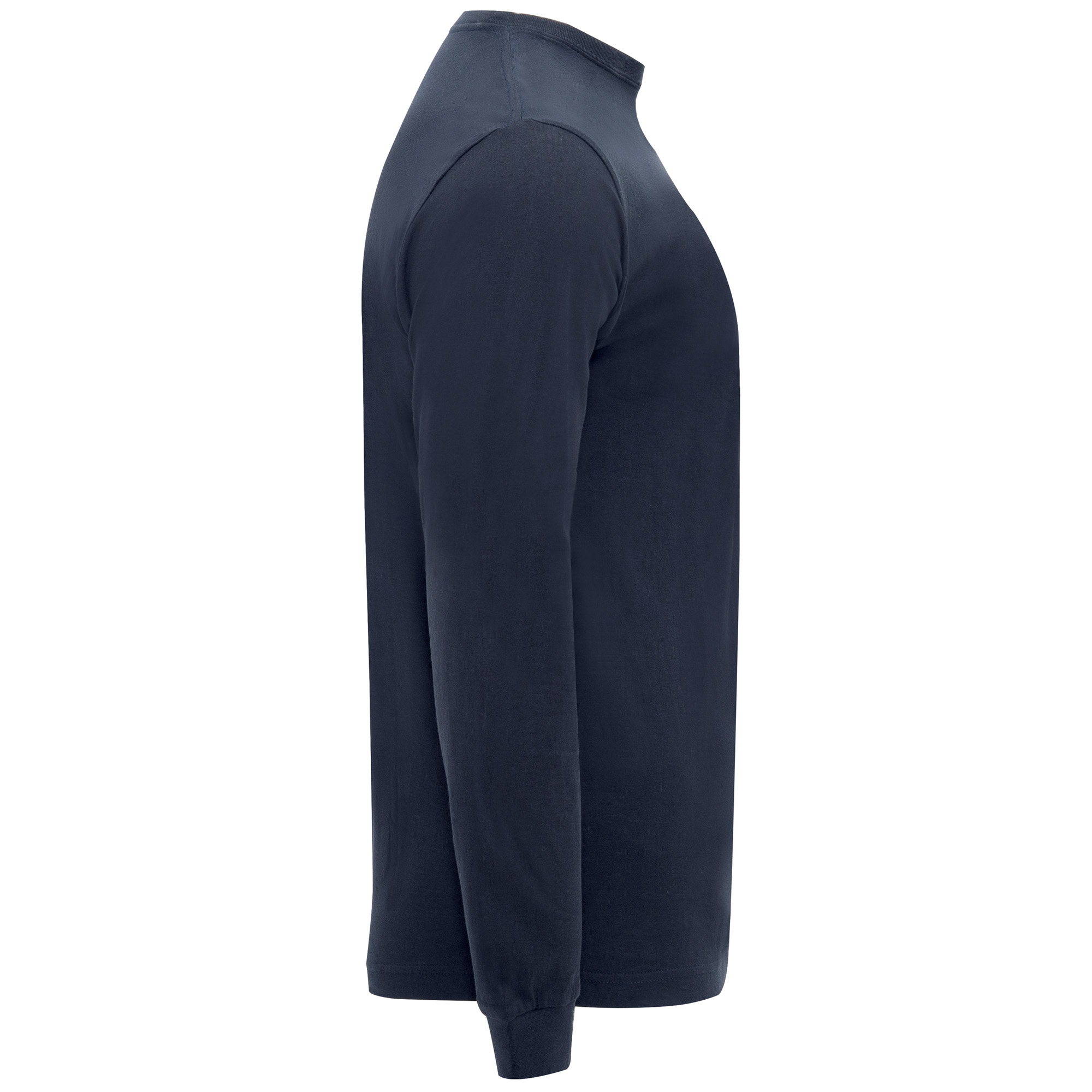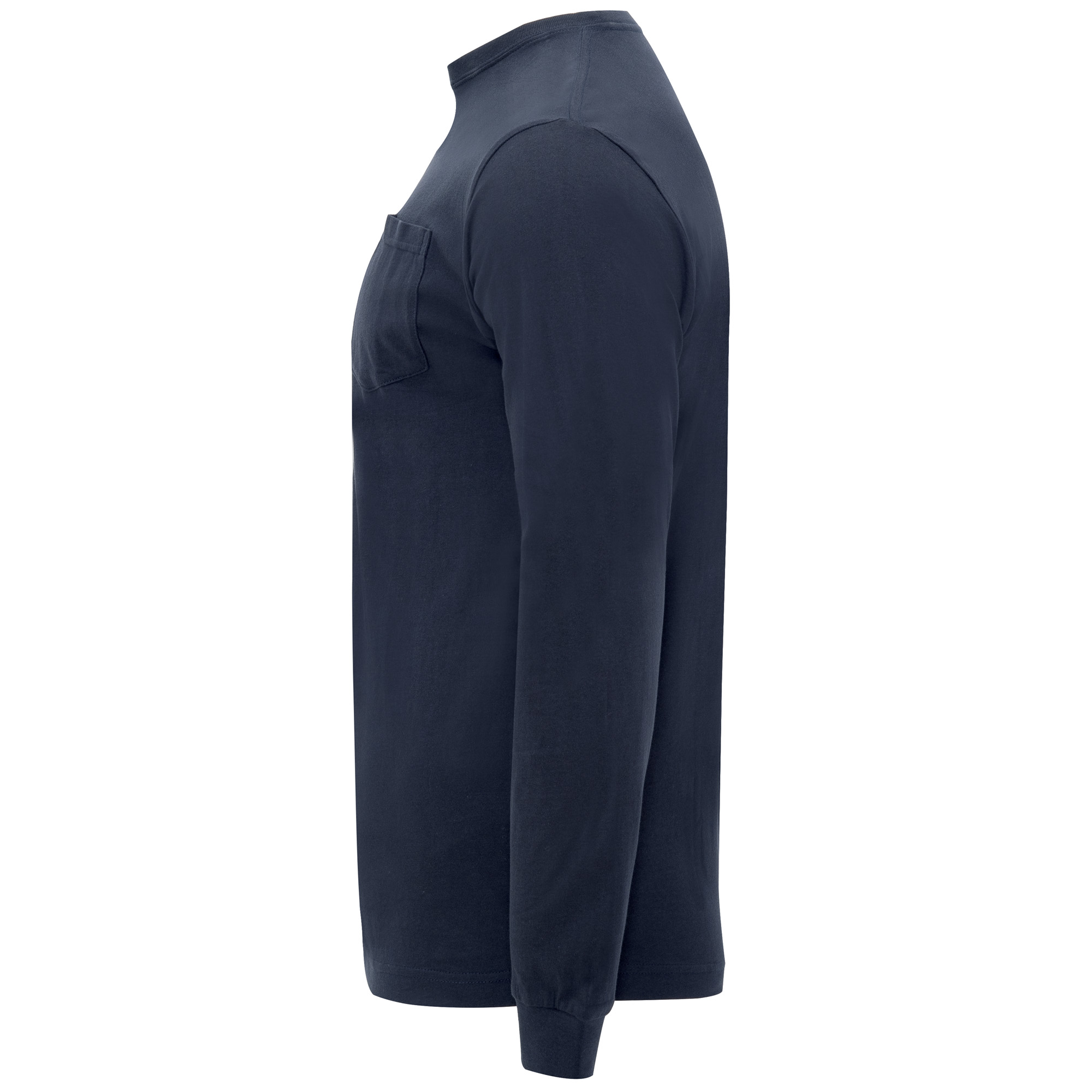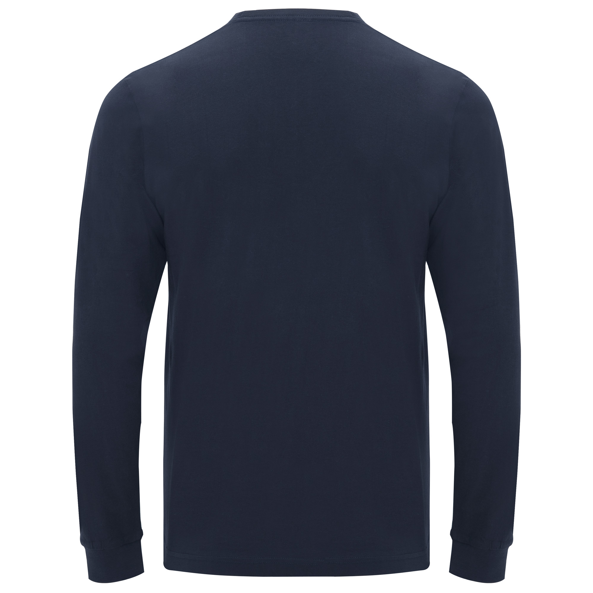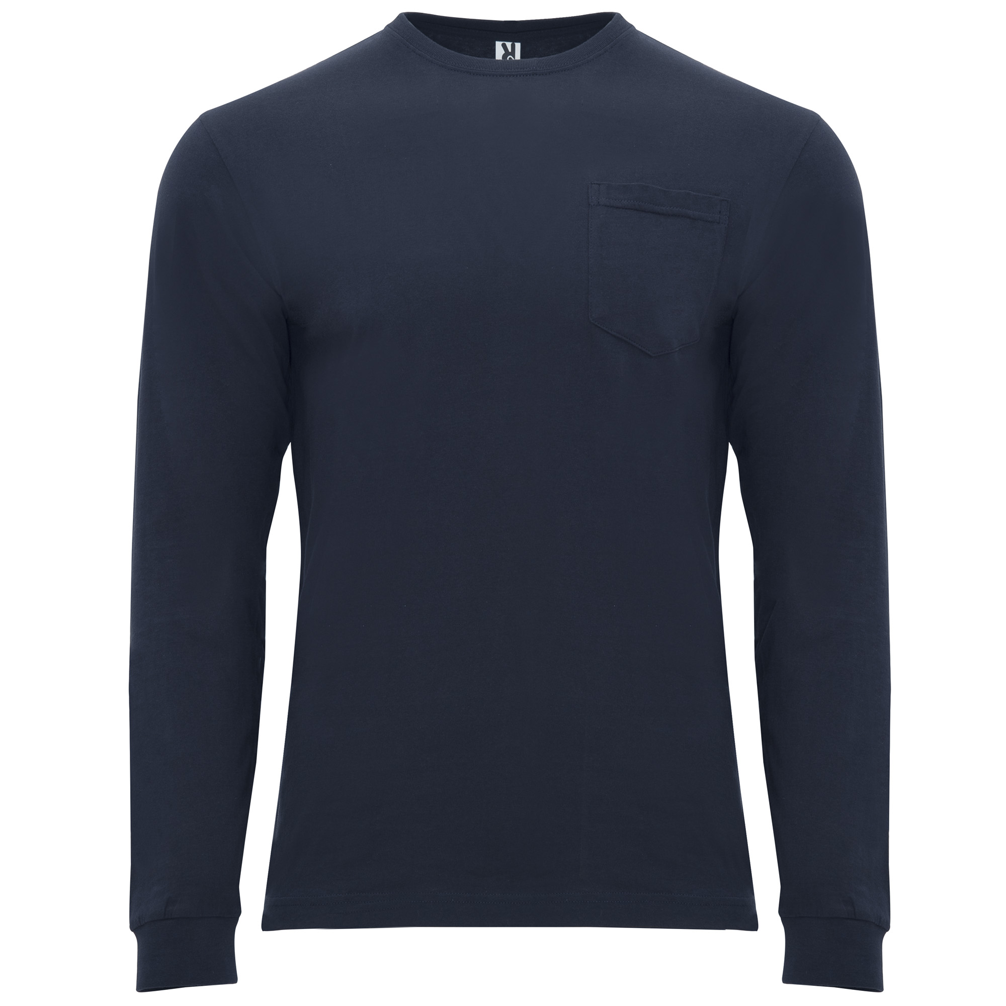 Camiseta de manga larga con cuello redondo y puños en canalé 1×1. Bolsillo en pecho izquierdo. Cubrecosturas reforzado en cuello y hombros.