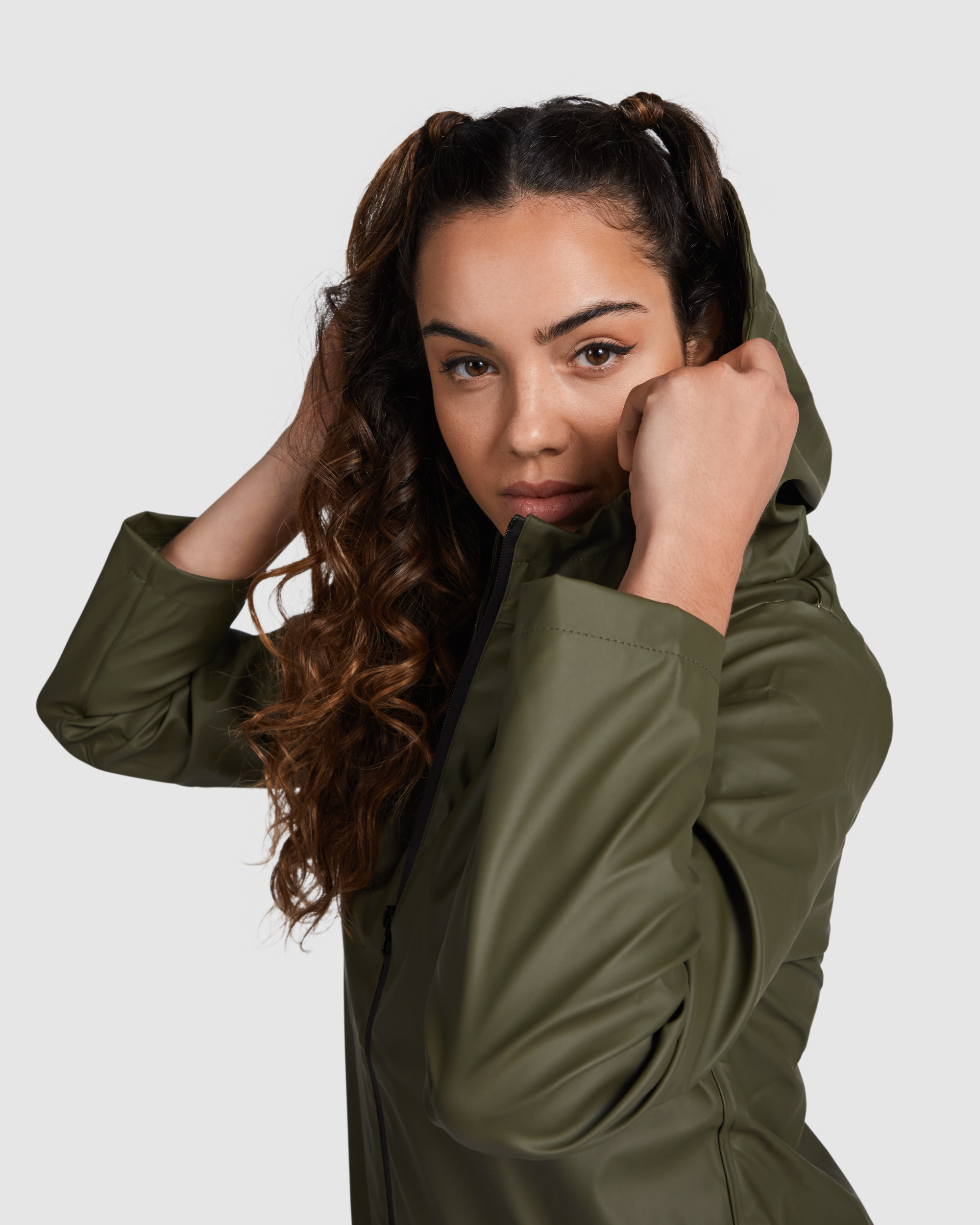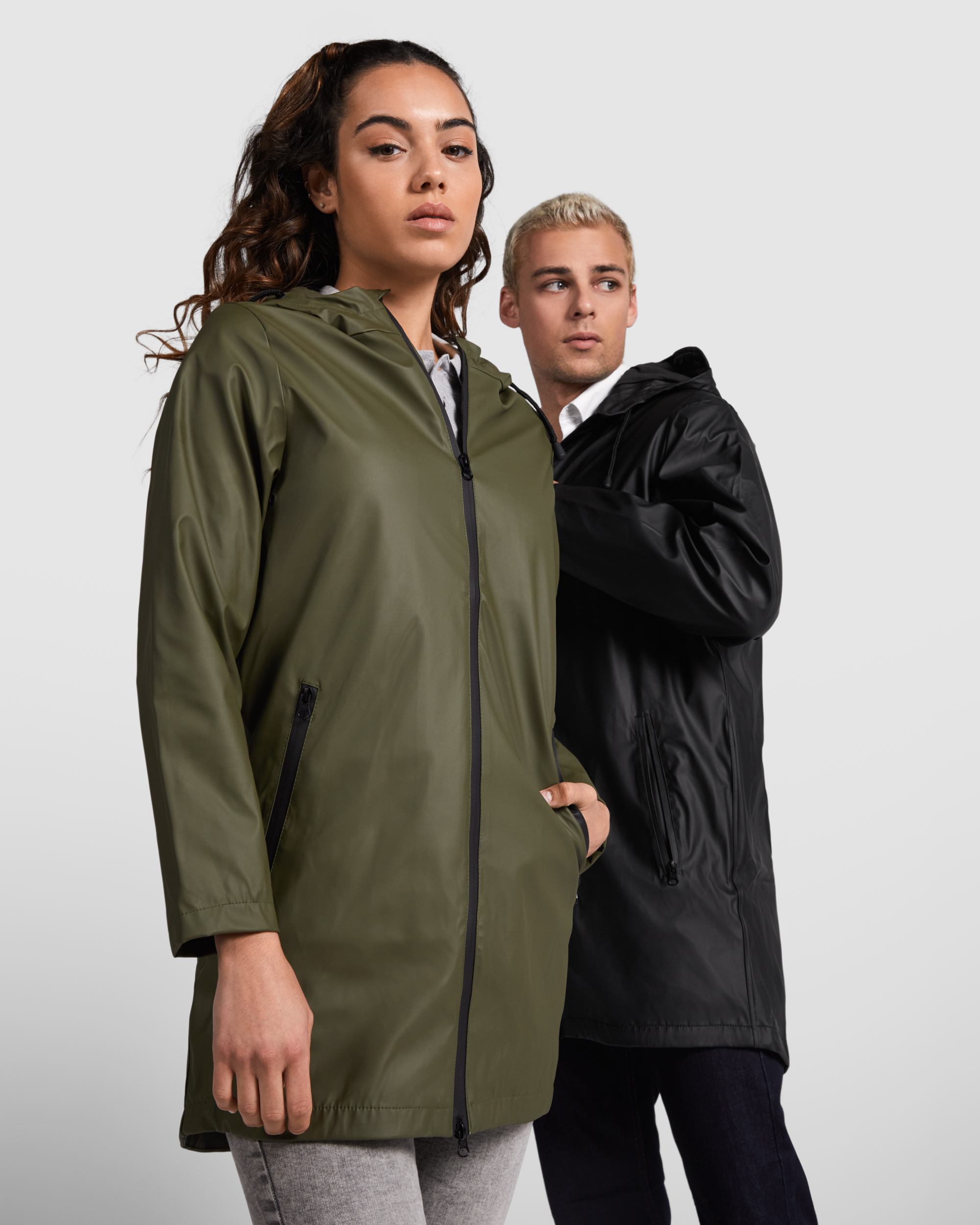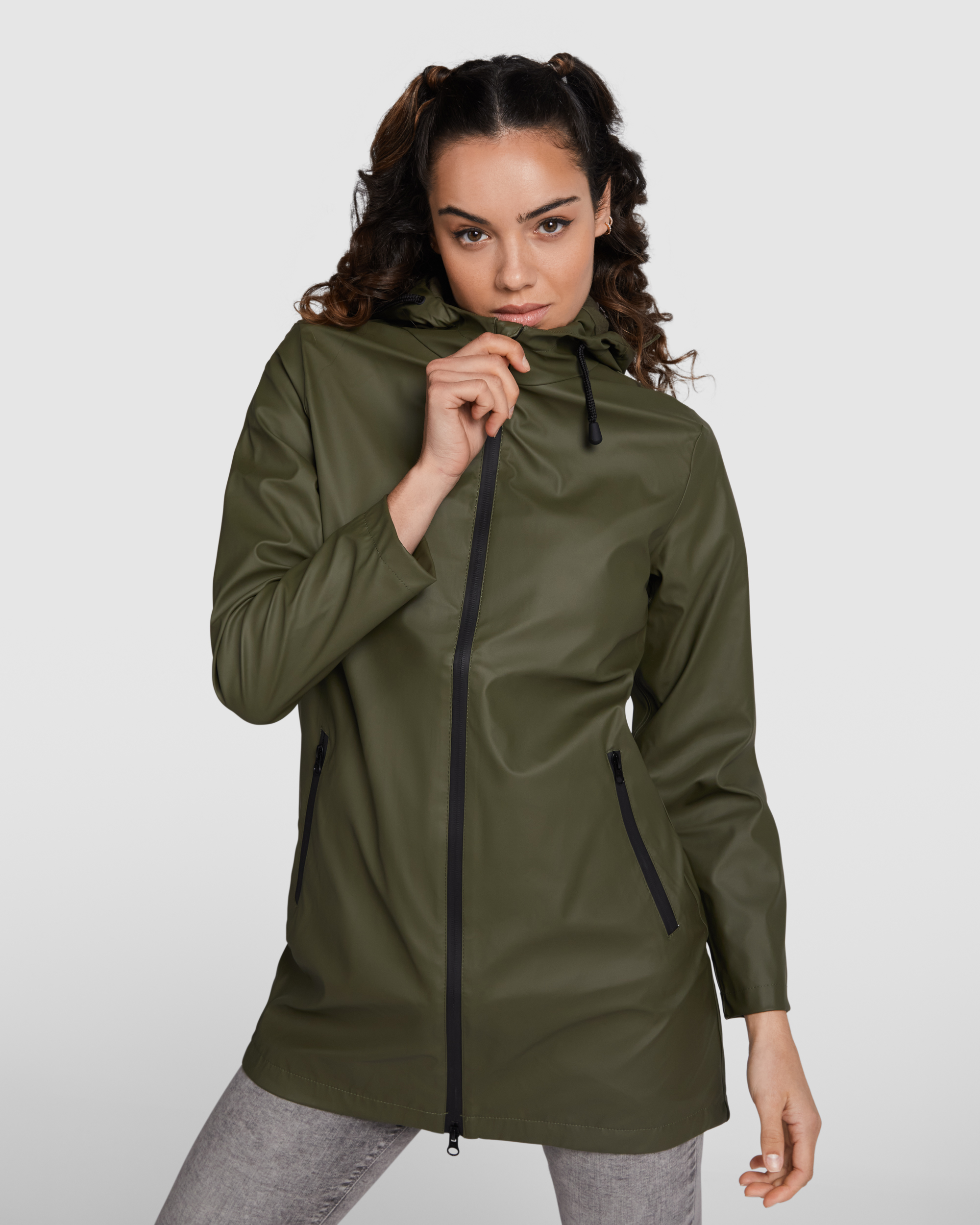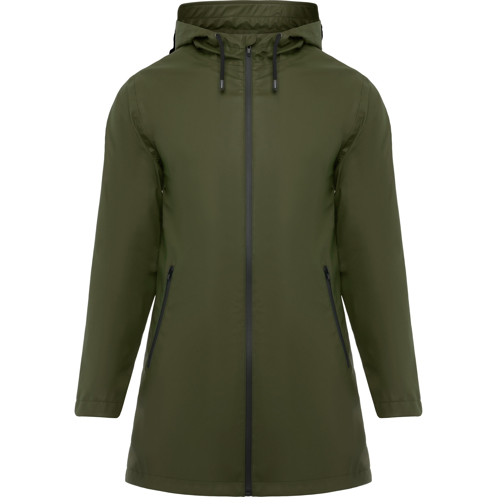 Chubasquero impermeable entallado para mujer. Capucha fija con visera. Cremalleras y costuras termoselladas. Detalles a contraste en color negro. Dos bolsillos laterales con cremallera. Bajo posterior con abertura.